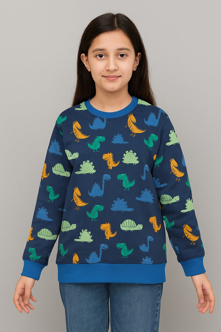 Designed with a playful dinosaur pattern in vibrant shades of green, orange, and blue, this sweatshirt brings fun and energy to any casual outfit. The ribbed cuffs, hem, and crew neckline ensure a perfect fit while maintaining its shape even after multiple washes.
