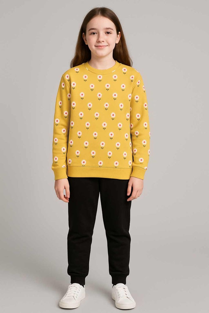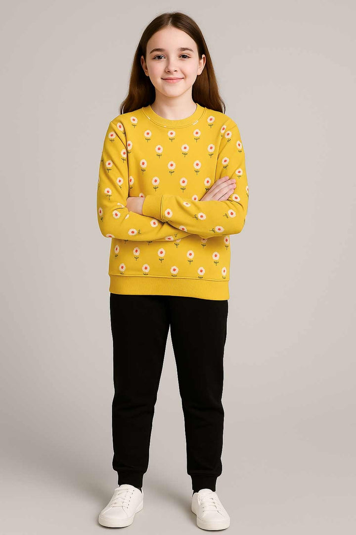 A trendy and comfortable outfit for girls featuring a mustard yellow sweatshirt with an all-over daisy print, matched with black jogger pants. Designed from soft, durable fabric, this set is ideal for daily wear, school, or weekend outings—offering both style and comfort in one look.