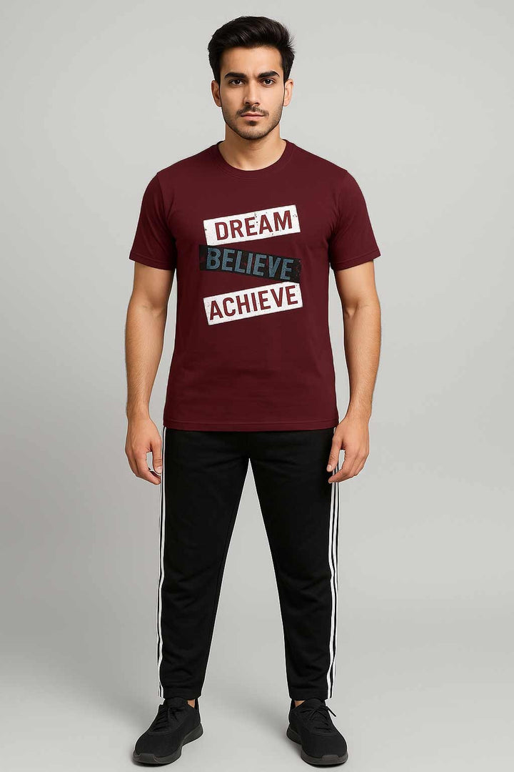 Relax in style with this men’s jersey cotton night suit, designed for comfort and a modern look. The set features a maroon short-sleeve t-shirt with bold "Dream, Believe, Achieve" print paired with black trousers detailed with dual white side stripes.