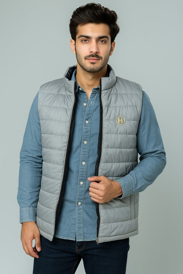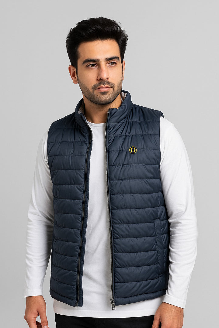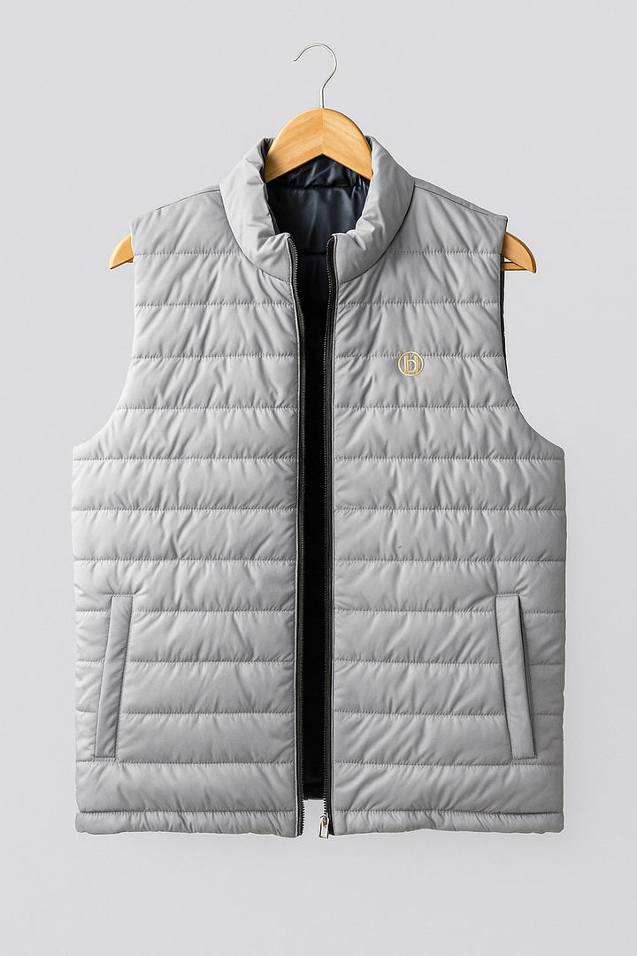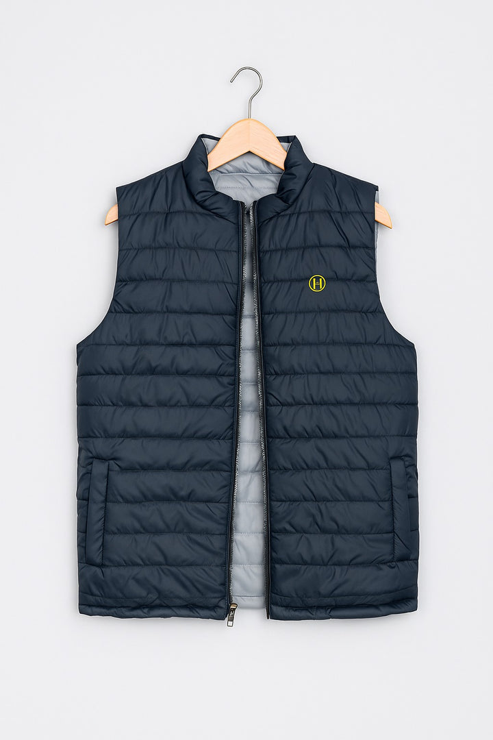 Design: Reversible sleeveless puffer jacket — stylish on both sides with navy blue and light grey color options.
