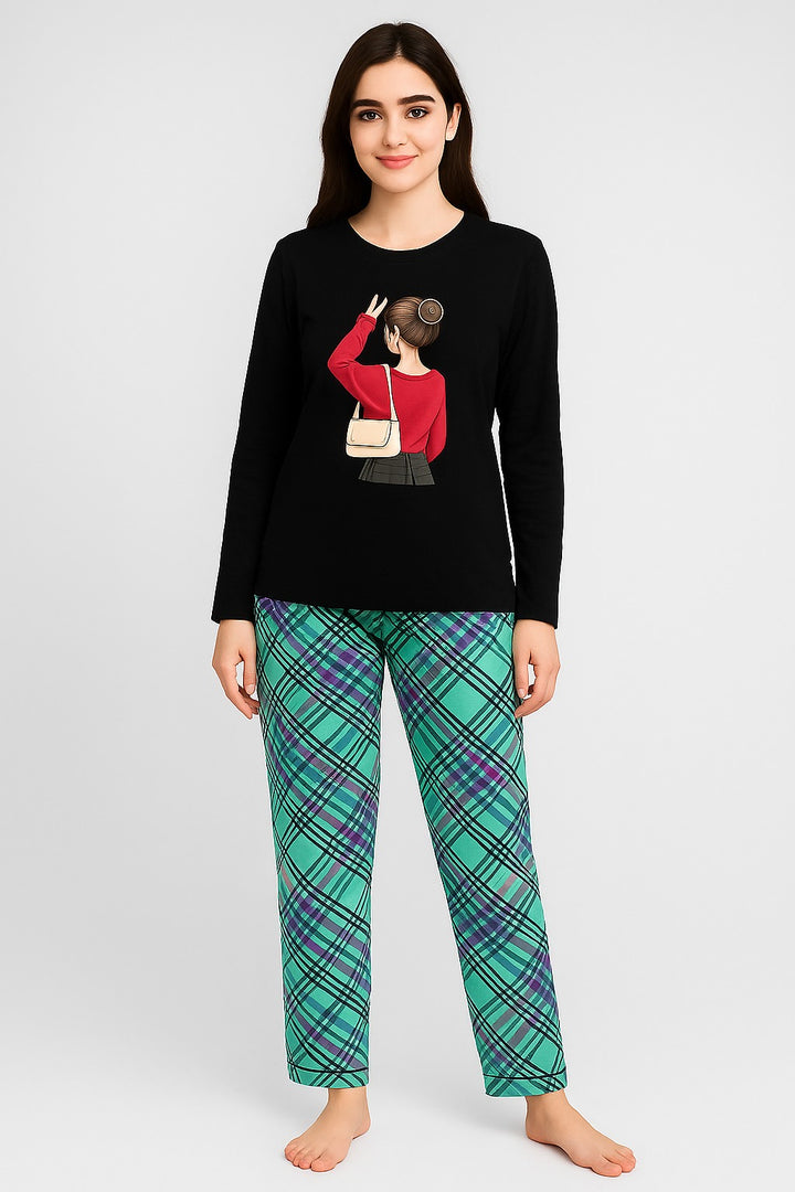 Relax in style with this Women’s Black Graphic Top and Green Plaid Pajama Set, crafted from premium cotton jersey fabric for maximum softness and comfort. The full-sleeve black top features a stylish girl illustration print, giving it a trendy and youthful look. The green plaid pajama bottoms offer a relaxed fit and an elegant winter vibe, perfect for lounging or sleeping..