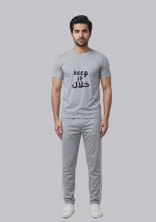 Stay comfortable and stylish with this men’s grey t-shirt and trouser set, designed for everyday lounging and nightwear. Made from soft and breathable fabric, the set ensures maximum comfort throughout the day and night. The t-shirt features a “Keep It Halal” print that adds a modern and expressive touch, while the matching trousers provide a relaxed fit with easy movement.