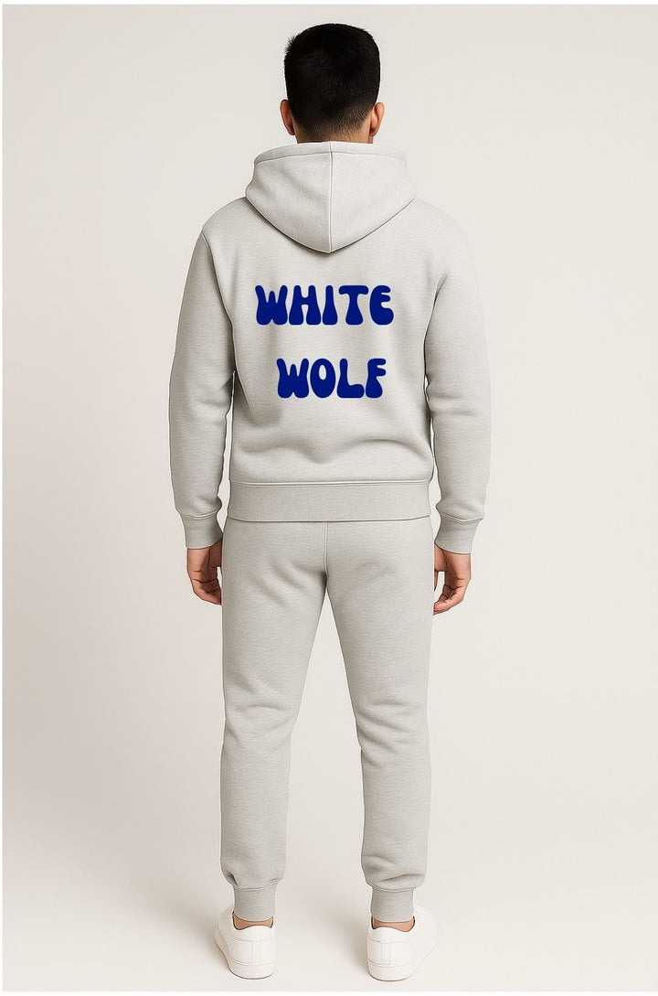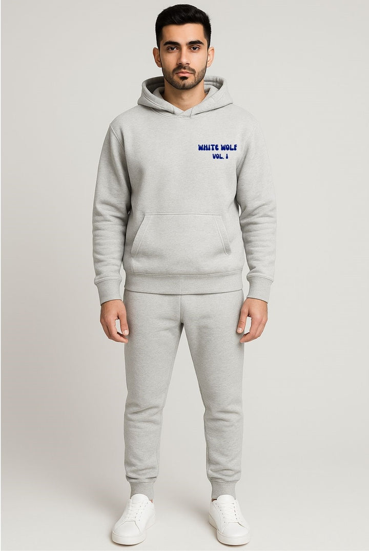 The hoodie features a signature White Wolf Vol.1 chest print and a large White Wolf logo on the back, giving a trendy and premium appearance. The kangaroo pocket, elastic cuffs, and adjustable hood add extra comfort and practicality. The matching fleece joggers are designed with an elastic waistband, tapered fit, and ribbed ankle cuffs for the perfect fit throughout the day.