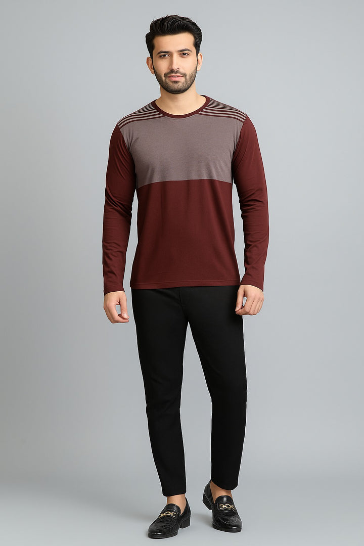 Designed with a modern two-tone maroon and grey color block pattern and subtle chest stripe detailing, this shirt combines minimalism with contemporary style. The round neckline and regular fit offer a timeless appeal, making it perfect for both casual outings and smart-casual wear.