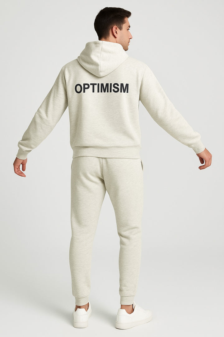 Elevate your casual style with this men’s grey “OPTIMISM” hoodie and jogger set, designed for comfort and confidence. Made from premium cotton fleece fabric, it offers a soft, cozy feel while keeping you warm during cooler days.
