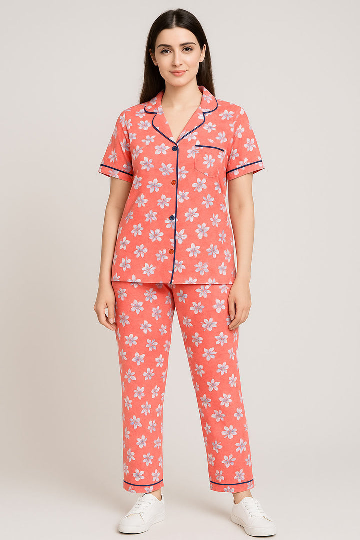 Stay stylish and comfortable with this breathable cotton night suit featuring a peach floral print. Perfect for sleep or lounging in all-day comfort.