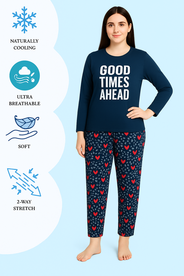 A stylish women’s pajama set featuring a navy blue, long-sleeve cotton top with a bold slogan print “GOOD TIMES AHEAD.” Paired with coordinated full-length pajama bottoms showcasing a vibrant all-over bird and floral motif in red and white, this set combines comfort with modern design. Ideal for nightwear or loungewear, offering both softness and durability for everyday use.
