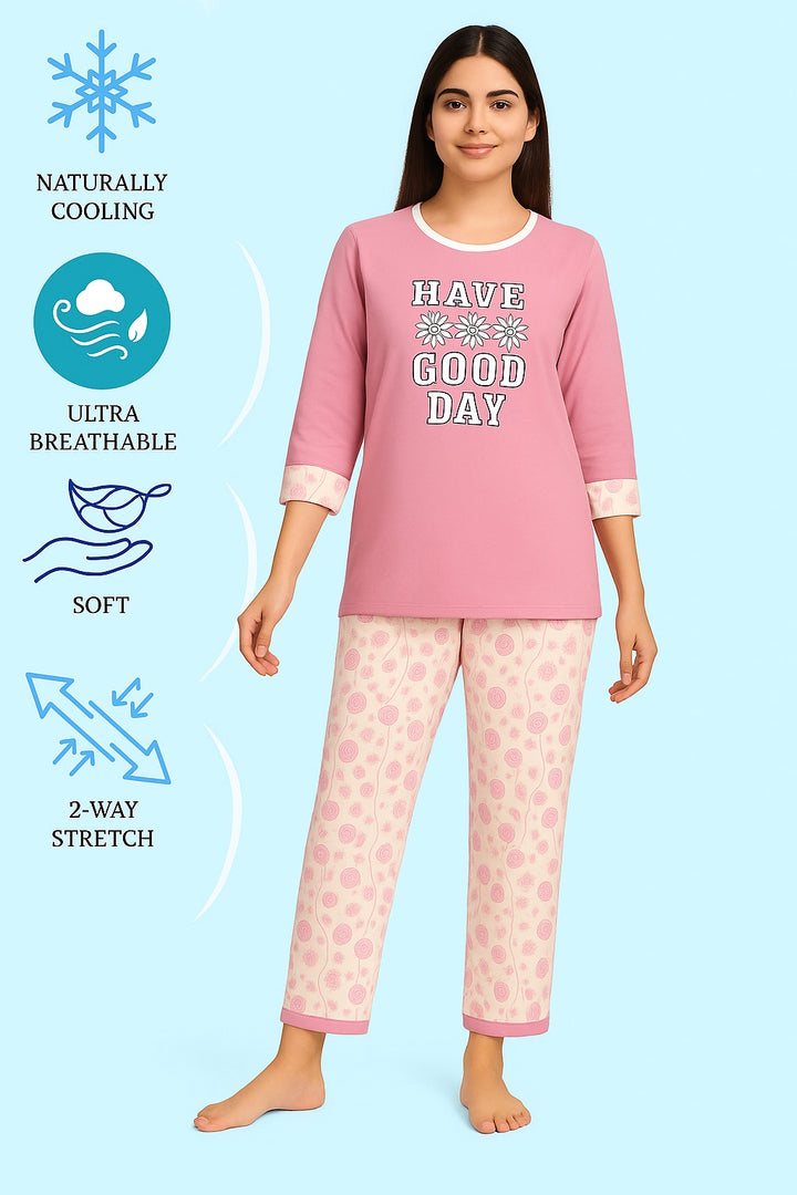 Bring positivity to your nights with this charming women’s night suit in soft pink, designed for comfort and style. The top features a cheerful “Have a Good Day” print with cute daisy flowers, while the pajama bottoms have a lovely all-over floral pattern for a fresh, feminine touch.
