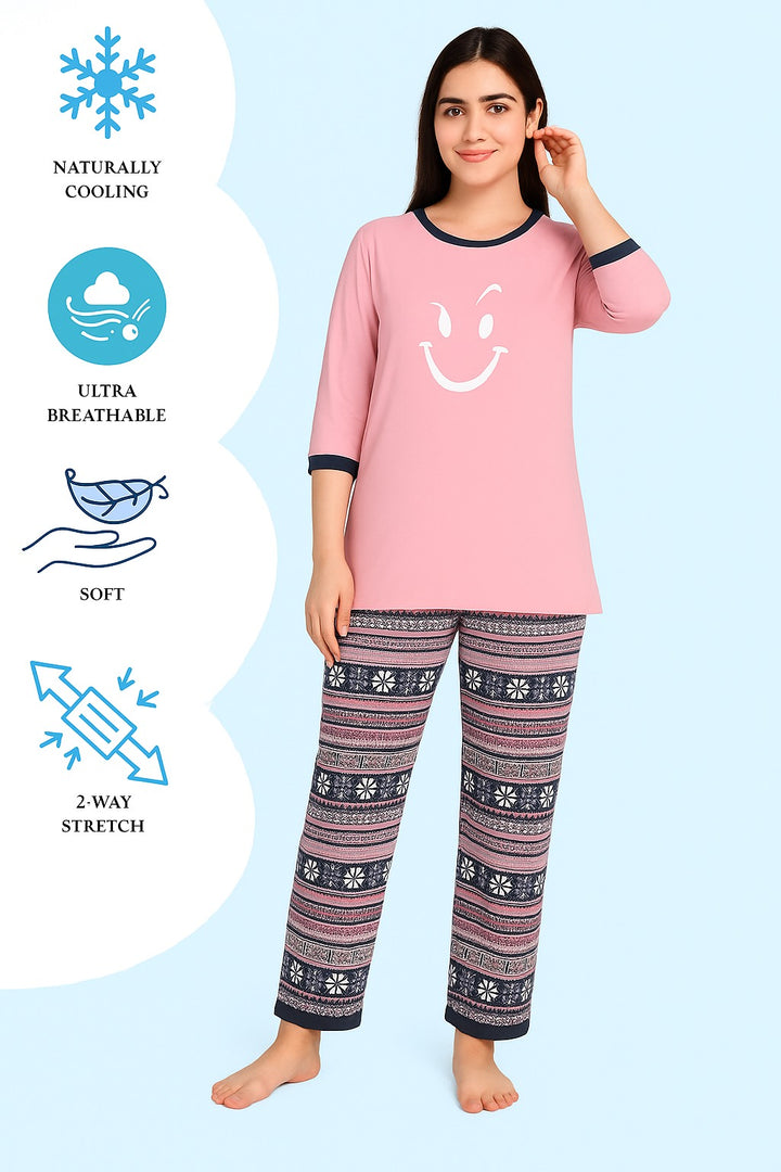 Bring positivity to your nights with this charming women’s night suit in soft pink, designed for comfort and style. The top features a cheerful “Have a Good Day” print with cute daisy flowers, while the pajama bottoms have a lovely all-over floral pattern for a fresh, feminine touch.