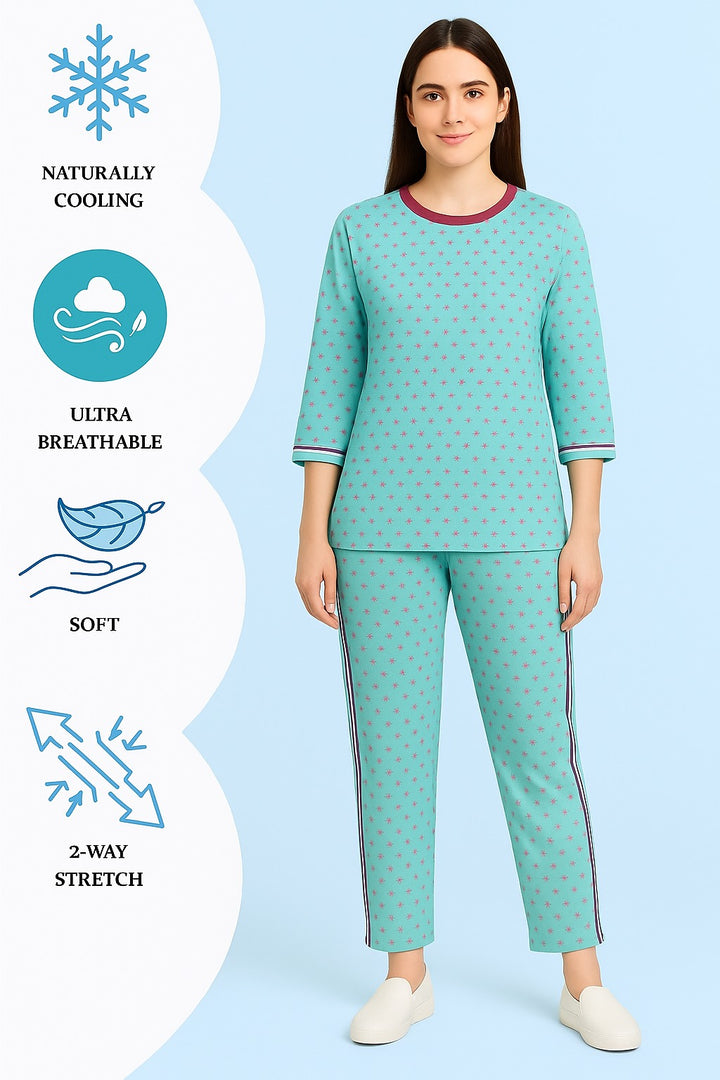 Women's T-Shirt and printed Three Stripe Trouser ( Powder Light Blue Short Flower )