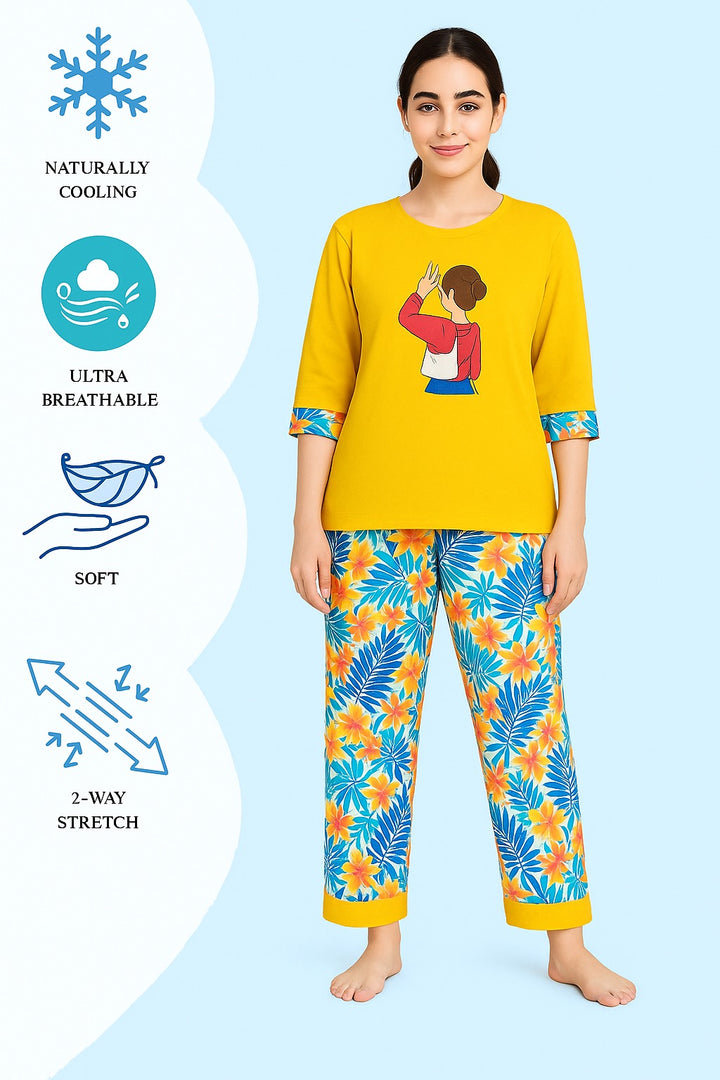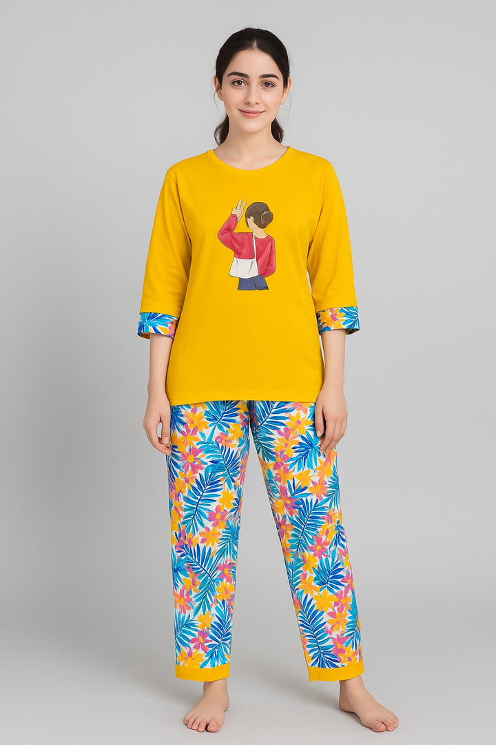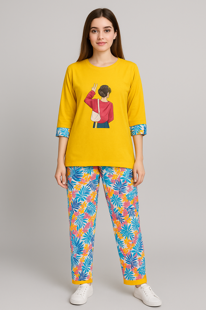 Stay stylish and comfortable at home with our Women’s Peace Sign Long Tee Lounge Set. Featuring a vibrant mustard yellow long T-shirt with a playful peace sign graphic and colorful cuff detailing, paired with tropical floral trousers for a fresh and fun look.